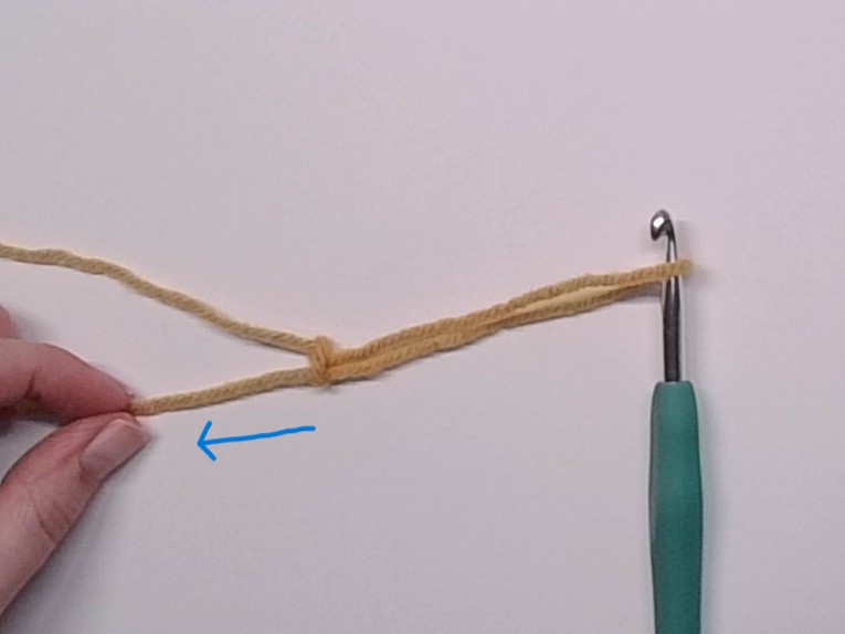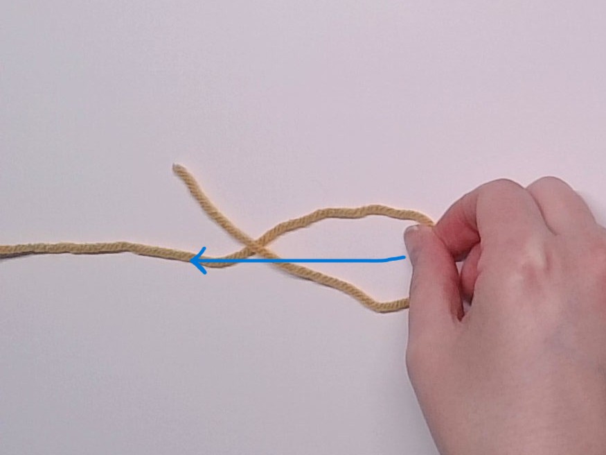 | 5. Grab the working yarn in the spot from the previous step and pull it up and to the right | 6. While holding the working yarn in place, pull the yarn tail with your other hand to tighten |