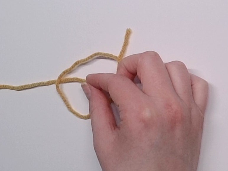 | 3. Grab the loop on the right and fold it over to the left on top of the working yarn and tail | 4. You should now have this shape with the working yarn running through the center |