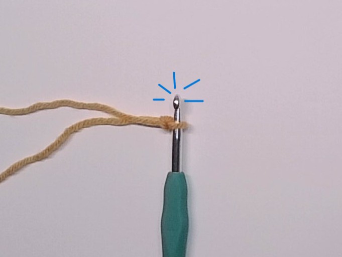 | 1. Start with your crochet hook on top of the yarn, with the tail below it and the working yarn above it | 2. Grab the working yarn and bring it over the hook and down next to the yarn tail |