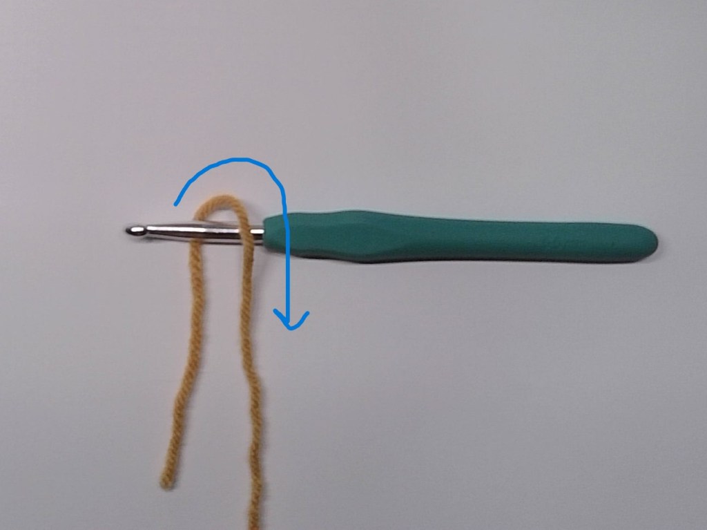 | 3. Move the working yarn underneath the yarn tail then up behind your hook like this | 4. Move the working yarn down and over your crochet hook. Moving the yarn over the hook like this is called ‘yarning over’ |
